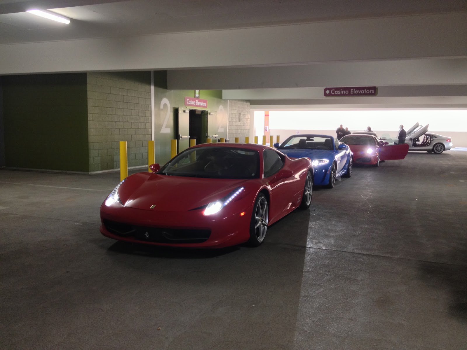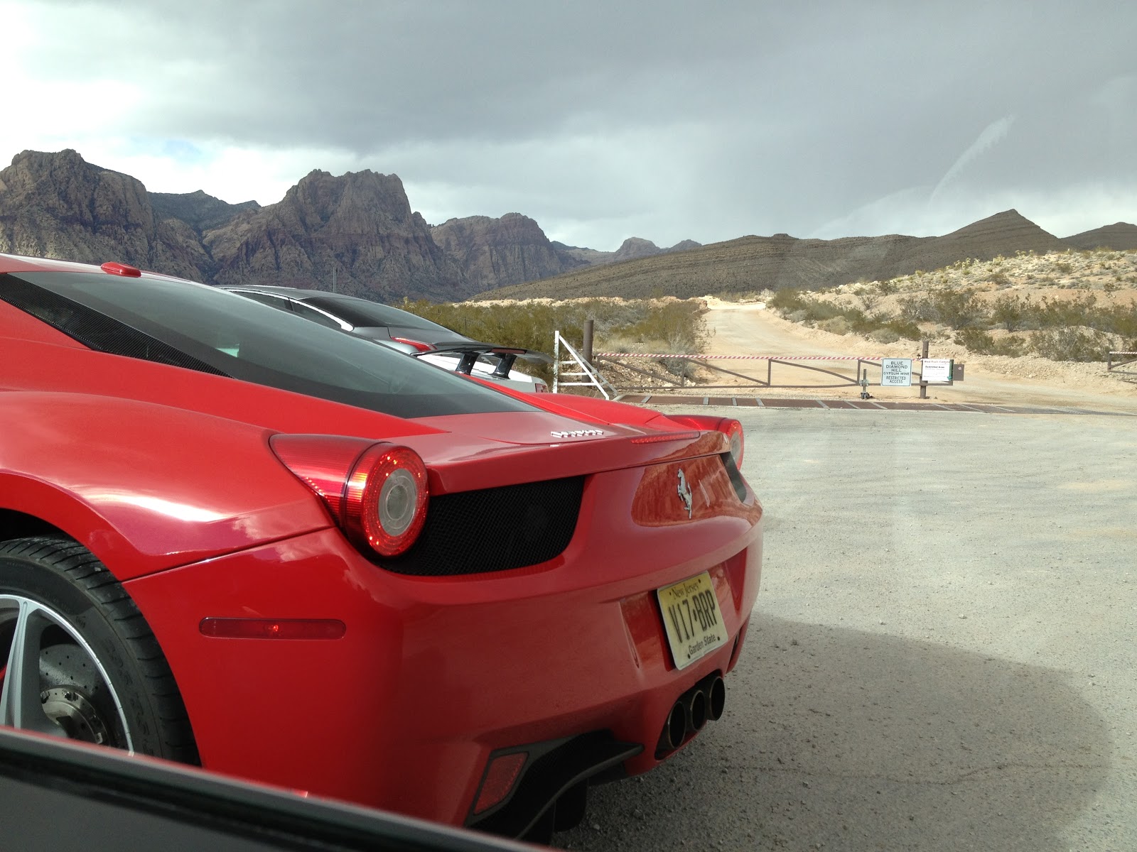 O passeio começa de dentro de um estacionamento, ainda dentro do perímetro urbano da Cidade de Las Vegas. Saímos todos de dentro de um estacionamento de alguns andares. Estando dentro de uma FERRARI com motor central, sem nunca ter dirigido ela, alguém deve pensar que conduzir a 458 dentro de um estacionamento não deve ser exatamente a tarefa mais fácil… rampas de acesso, valetas, lombadas etc.