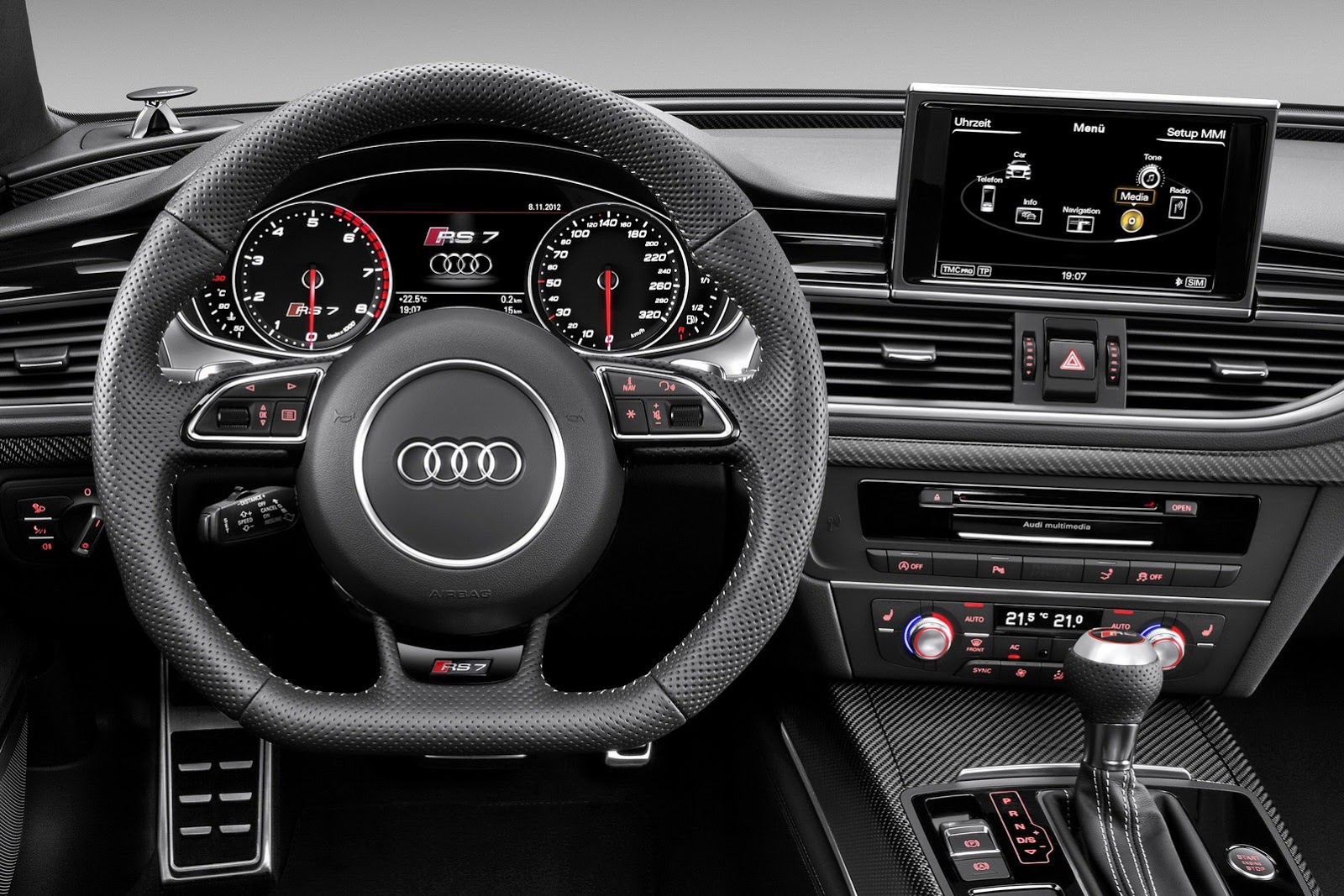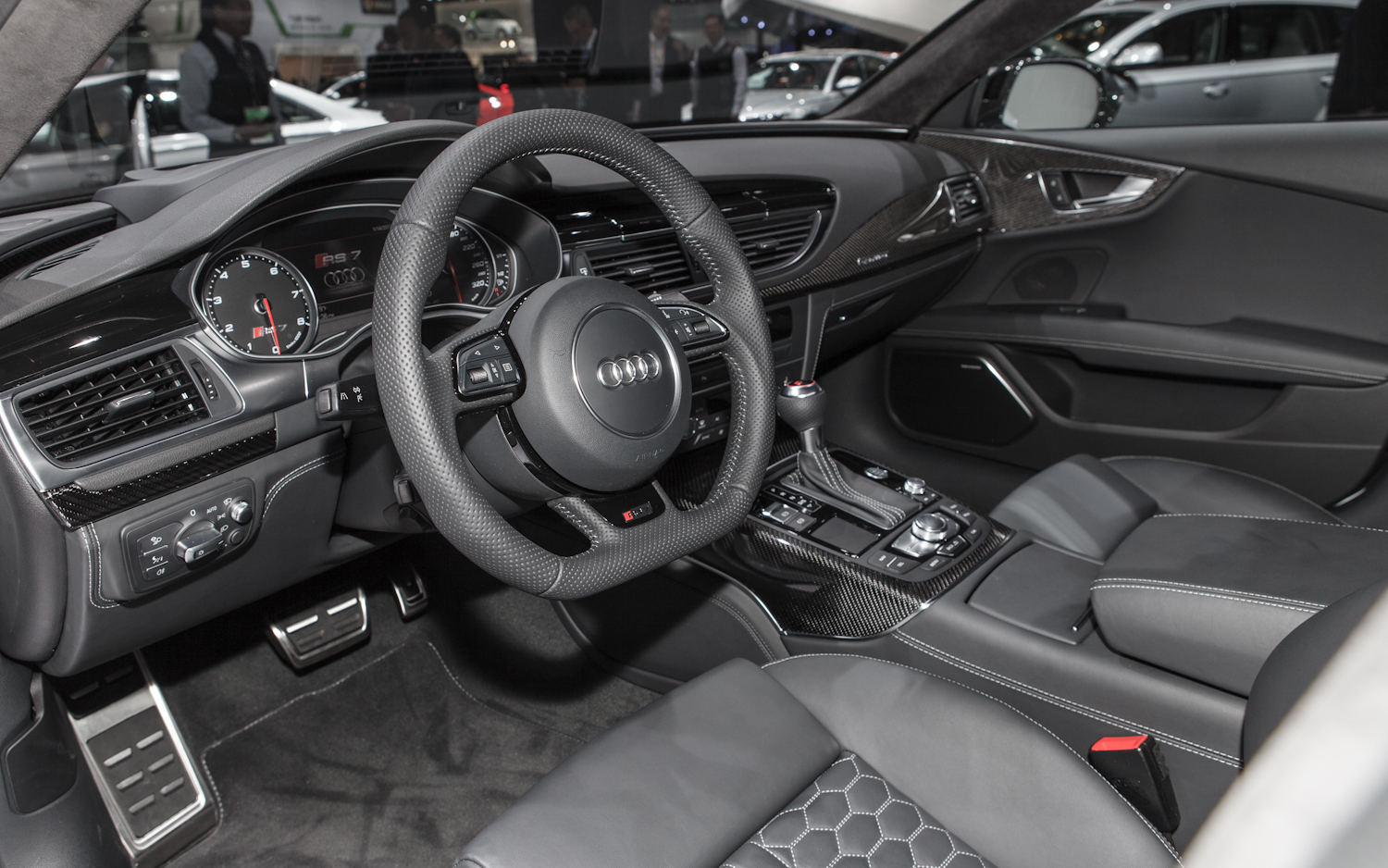 O interior do carro é equipado com o melhor em termos de acabamento da Audi, que, na minha opinião, hoje, faz cabines mais bonitas que a BMW e a Mercedes Benz. O RS7 é muito semelhante nesse aspecto aos seus irmão “mais simples”, com a diferença que o irmão “bravo” tem o badge “RS” tatuado por todos os cantos.